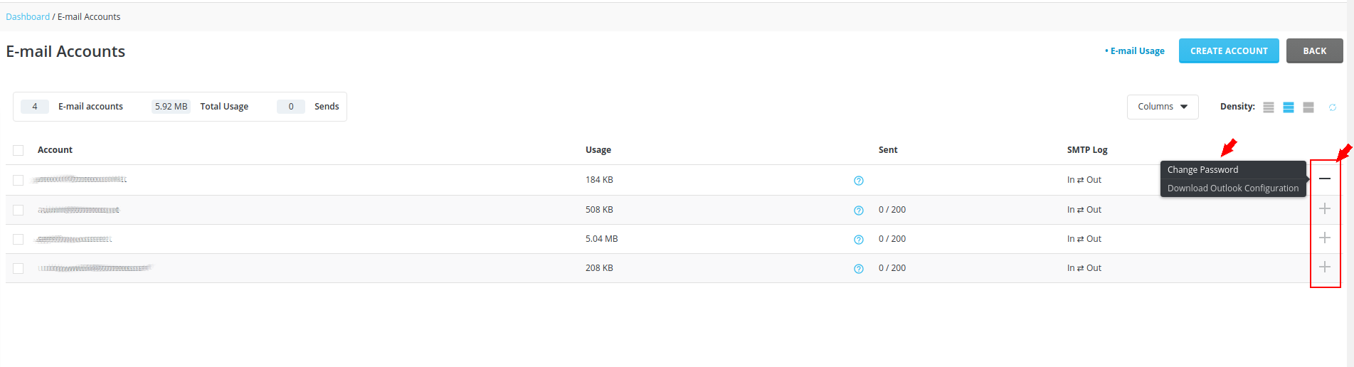 On the far right is a row of "+" icons and when clicked provide the pop out menu for "Change Password" and "Download Outlook Configuration"