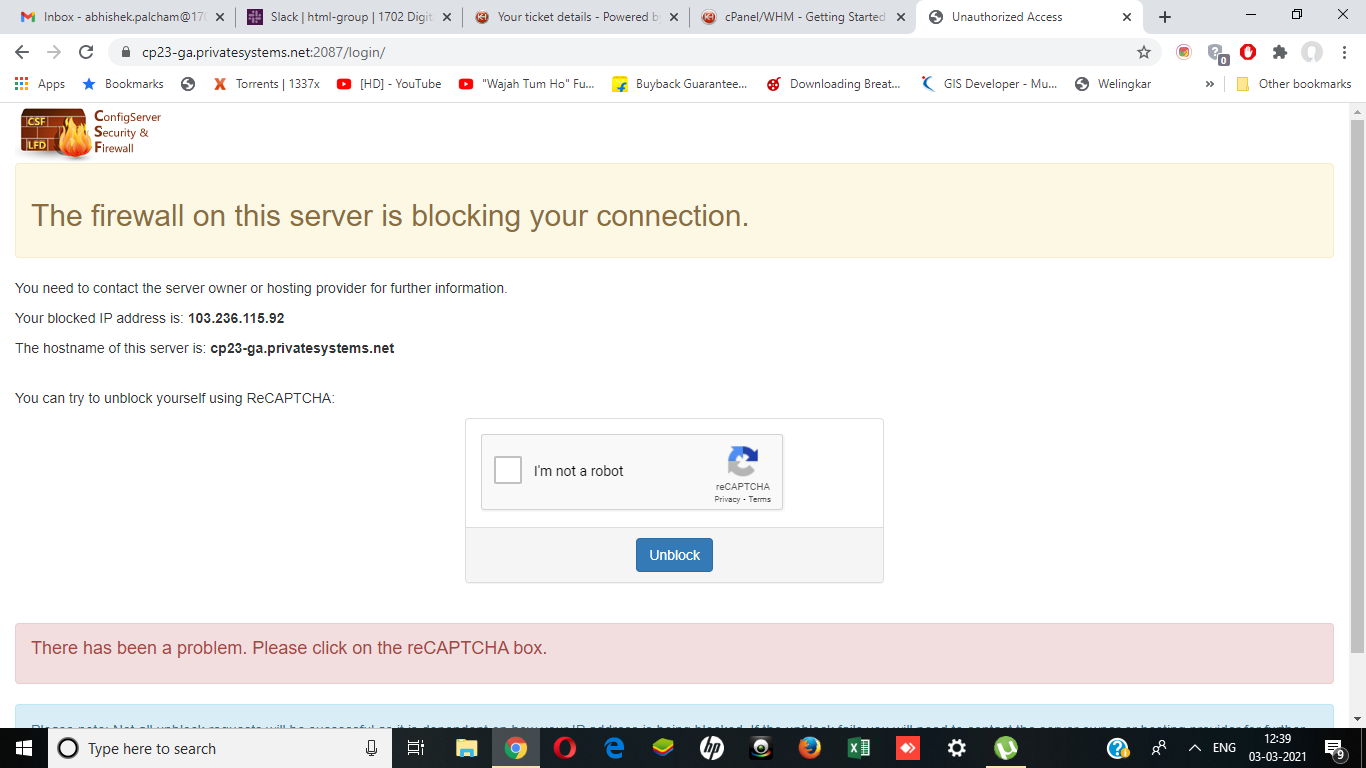 The hostname of this server is: cp23-ga.privatesystems.net". I am attaching the screenshot below . Kindly help me to resolve the issue.